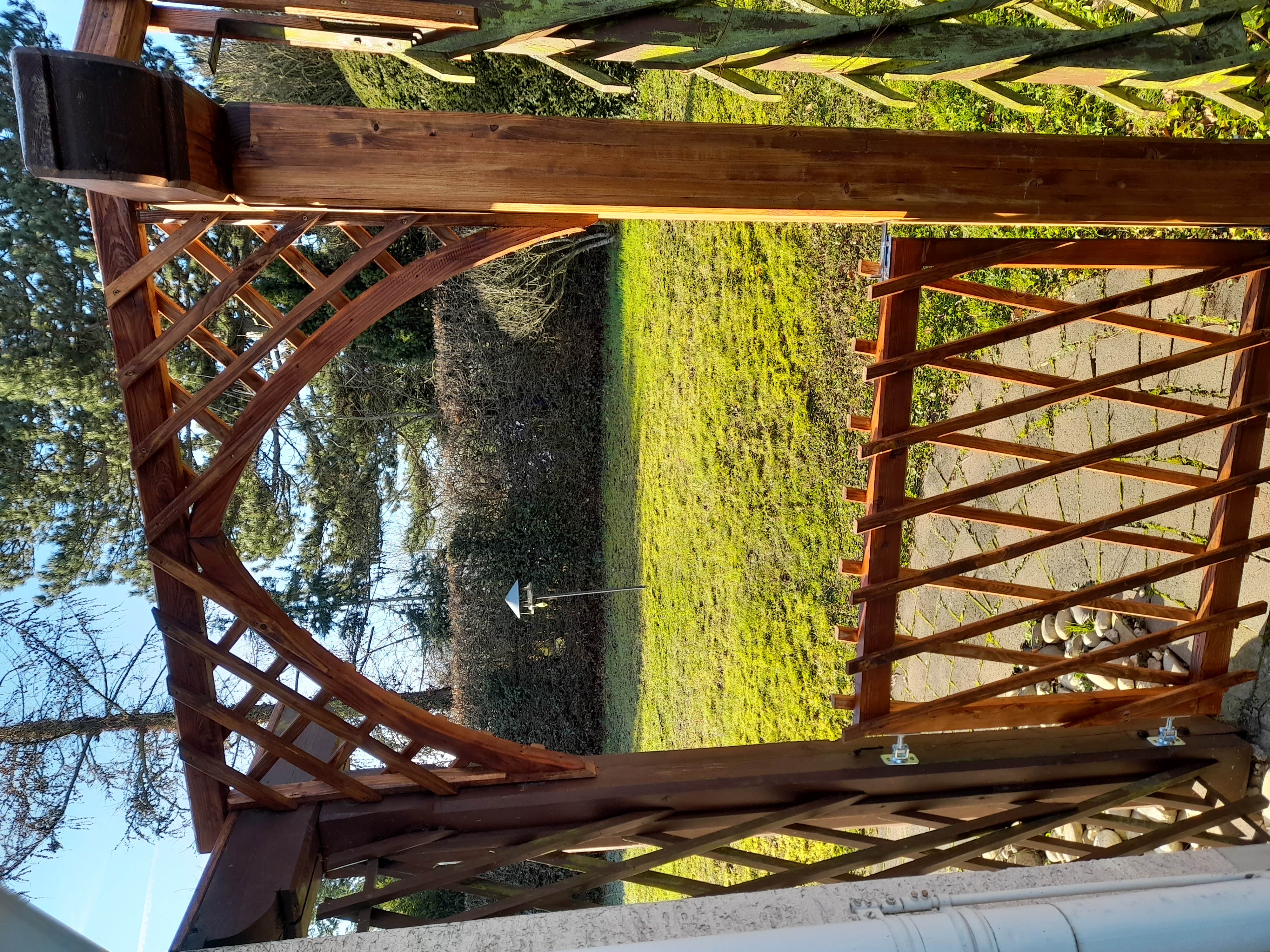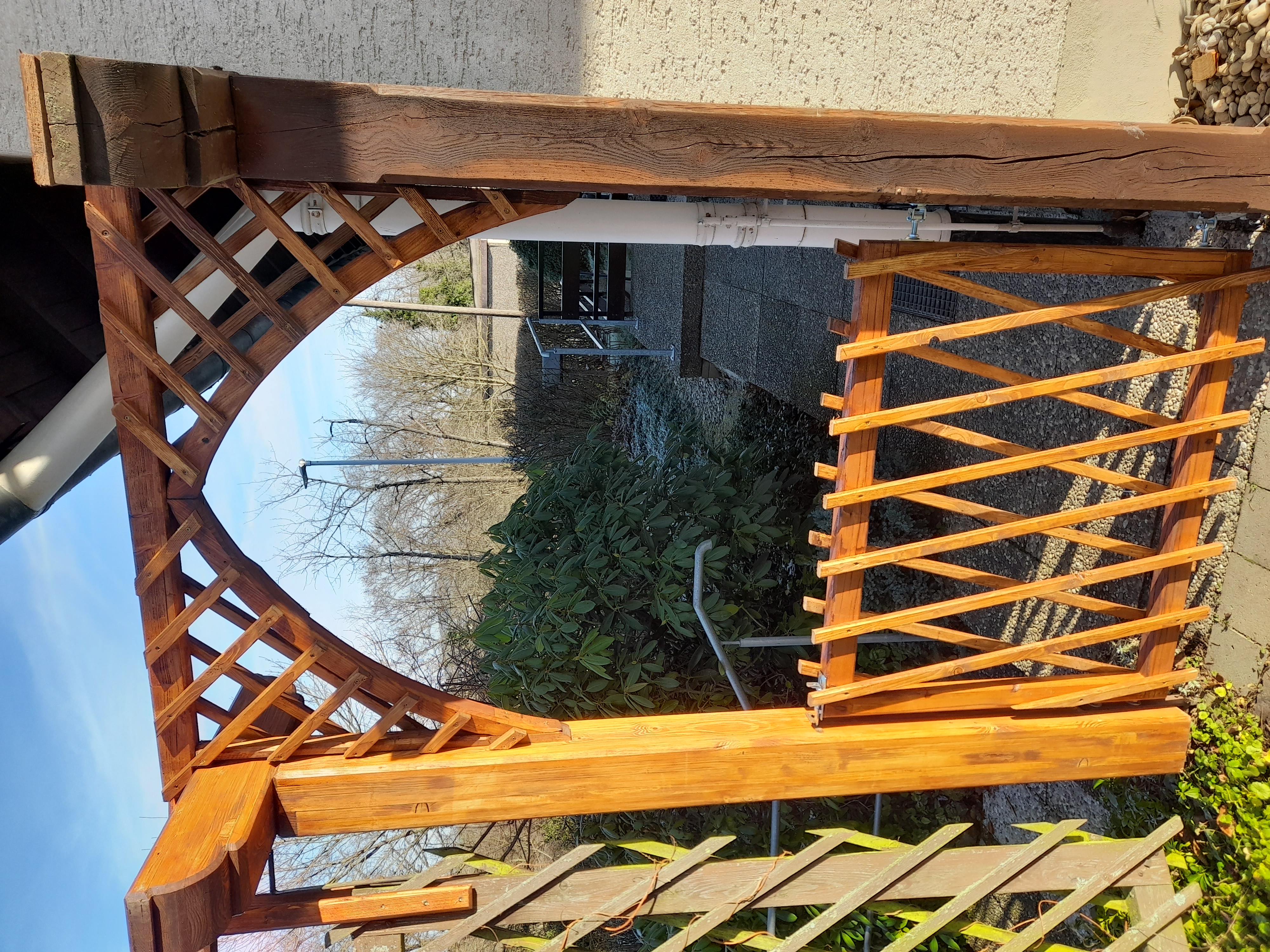 Hier wurden von den beiden dicken Pfosten der helle, rötliche komplett neu gebaut, und auch der Torbogen und das Gartentörchen